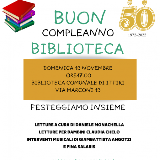 News Ittiri: Buon compleanno biblioteca La biblioteca comunale di Ittiri compie 50 anni. 4 Novembre 2022