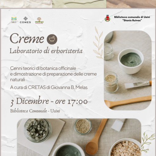 Attività Eventi News Usini: Creme, laboratorio di erboristeria Creme naturali, fantasia e sostenibilità 24 Novembre 2025