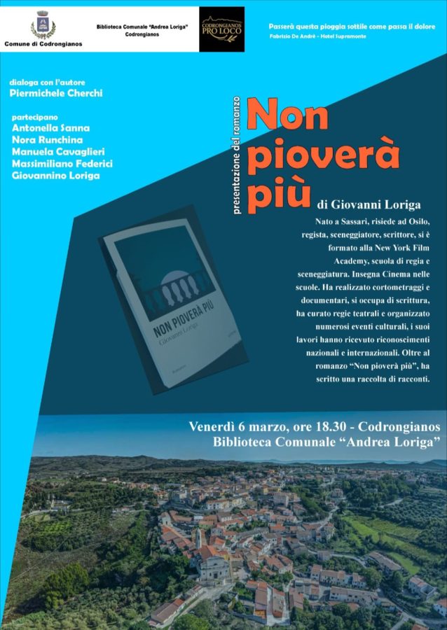 Il Comune di Codrongianos, insieme alla Pro Loco Codrongianos, in collaborazione con la Biblioteca Comunale “Andrea Loriga”, è lieto di invitare la cittadinanza alla presentazione del romanzo: