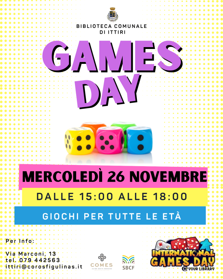 Mercoledì 26 Novembre, dalle 15:00 alle 18:00, la Biblioteca Comunale di Ittiri organizza un pomeriggio dedicato ai giochi da tavolo, in occasione dell’International Games Month.