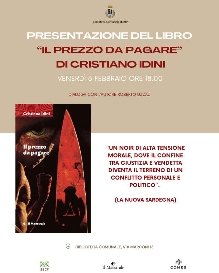 Venerdì 6 febbraio alle ore 18:00, la Biblioteca Comunale di Ittiri ospiterà lo scrittore Cristiano Idini, che presenterà il suo libro Il prezzo da pagare (Ed. Il maestrale) .Dialogherà con l’autore Roberto Uzzau.