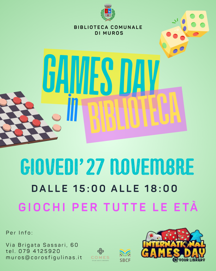 Giovedì 27 novembre, dalle 15:00 alle 18:00, la Biblioteca Comunale di Muros propone un pomeriggio di giochi da tavolo, in occasione dell’International Games Month.