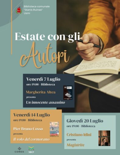 Nel mese di luglio, la Biblioteca comunale di Usini, in collaborazione con l’Amministrazione, il Sistema Bibliotecario Coros Figulinas e la cooperativa CoMeS, organizza l’evento Estate con gli autori, un ciclo di incontri per conoscere e ritrovare gli autori del territorio.