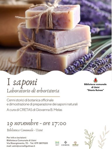 La Biblioteca di Usini, in collaborazione con l’Amministrazione comunale, il Sistema bibliotecario Coros Figulinas e la Cooperativa Comes organizzano un laboratorio dedicato al mondo delle erbe officinali e dei saponi artigianali.